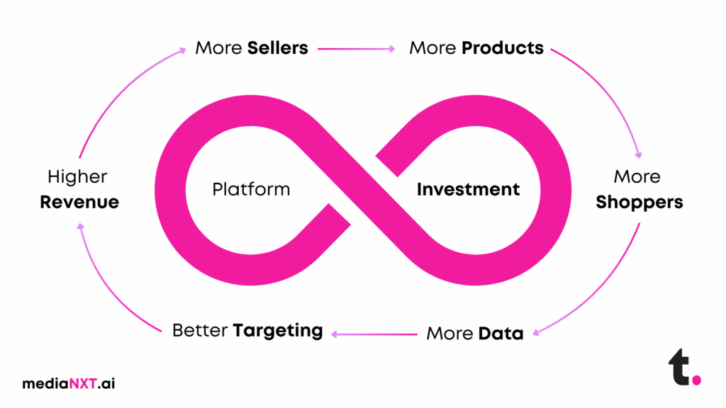 Retailers with marketplaces gain more than sellers – they gain signals. Every third-party listing, click, and conversion adds data to the system. This powers a retail media flywheel: